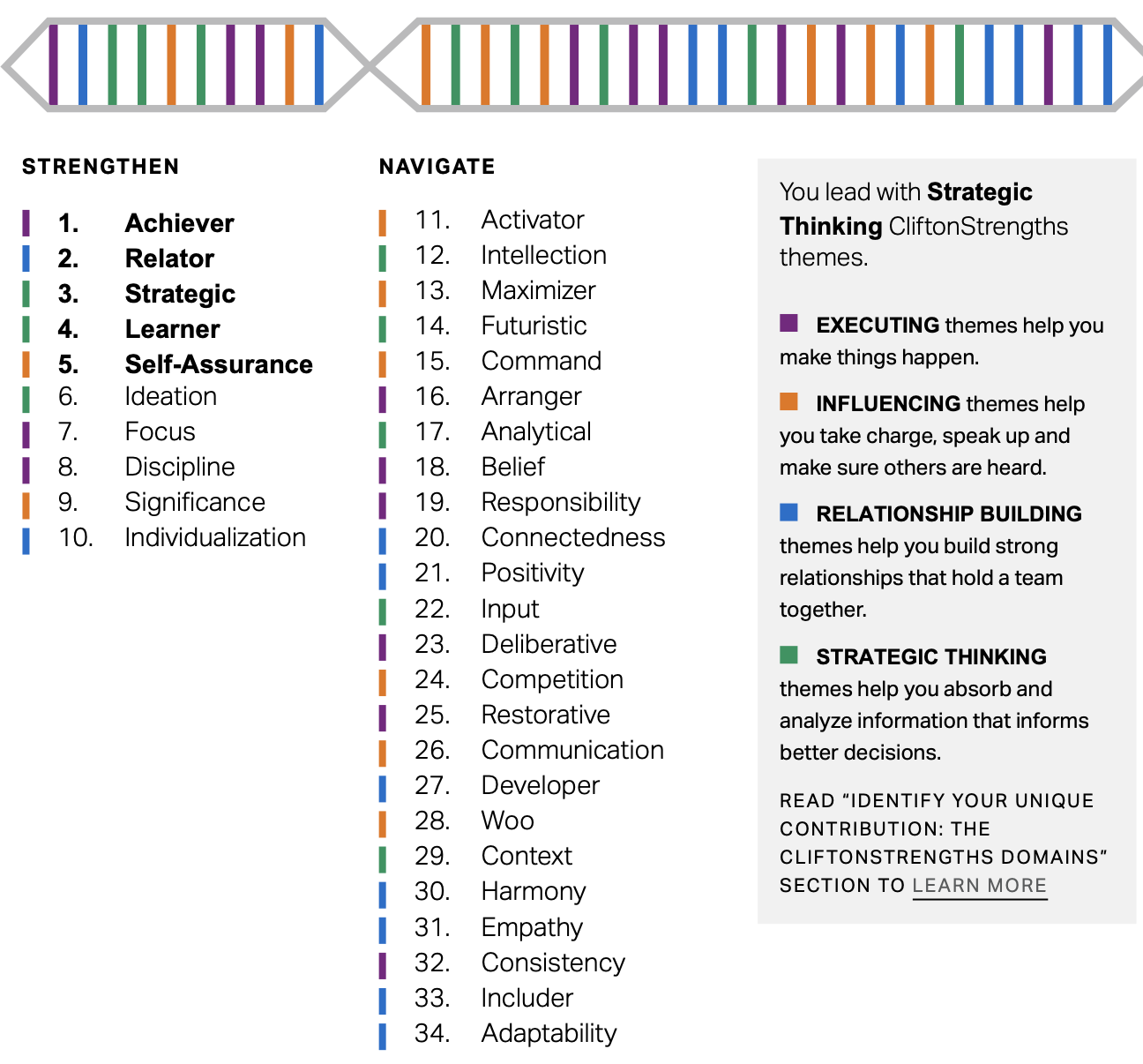 За методологію Gallup Clifton Strengths мої топ-5 талантів: Achiever, Relator, Strategic, Learner, Self-Assurance. Ці таланти допомагають мені бути ефективною у створеній методології та програмі.